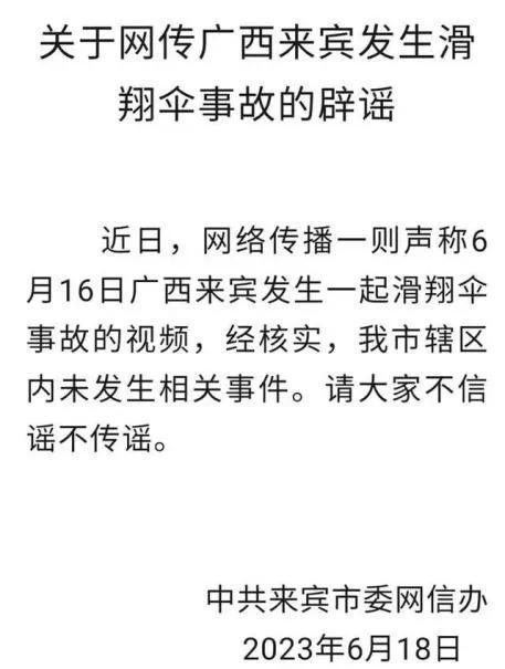 18日上昼9时57分,中共宾客市委网信办通过微信公众号网信宾客发文辟谣称:近日,相聚传播一则宣称6月16日广素质客发生一都滑翔伞事故的视频,经核实,该市辖区内未发生联系事件,并请各人不信谣不传谣。