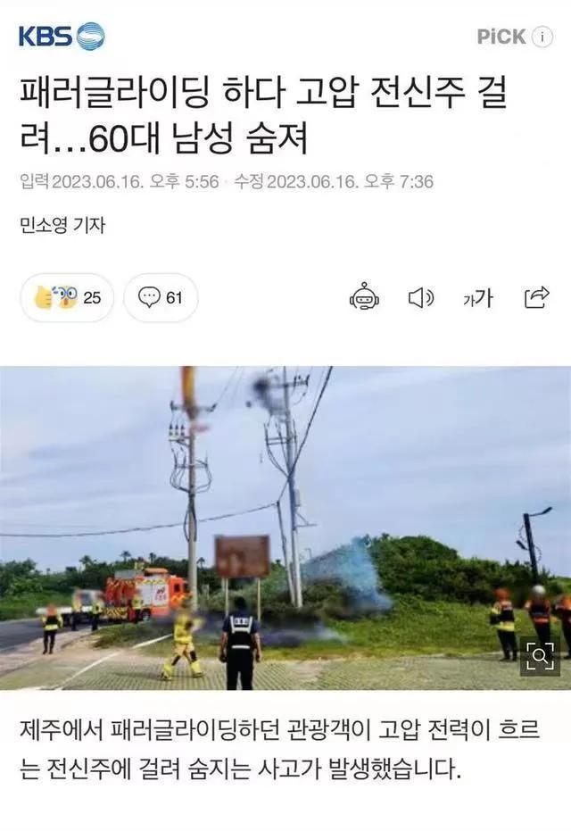 据韩国媒体报说念,6月16日下昼4时35分支配,韩国济州西部消防署知道接到报警,称在济州西归浦市城山邑涉地小径海滩近邻,有滑翔伞降落时东说念主被电线杆高压线卡住。消防员救助时,该60余岁男人已就地厌世。