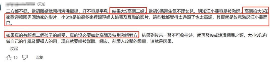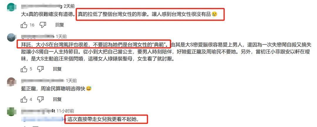大S此次带走犬子的行径曝光之后,在台湾省的风评愈加不好了,原来她之前搞“姐妹淘”、“小团体”那一套就不招网友待见,用孩子威逼汪小菲的事情曝光之后,台湾省网友示意大S的确是在拉低台湾省女性的形象。